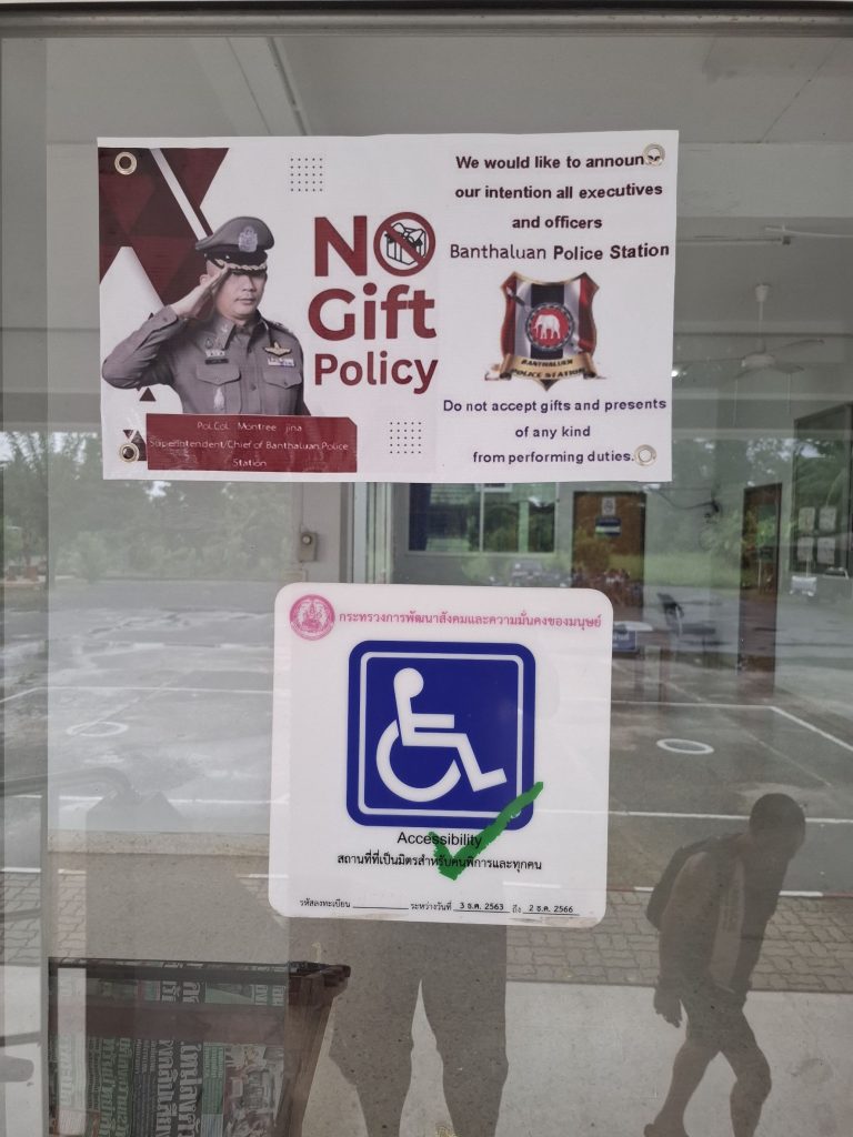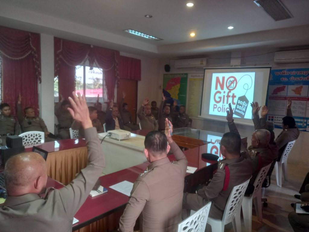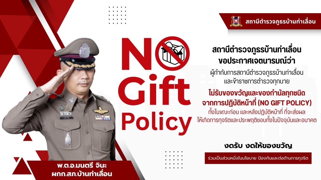 พ.ต.อ.มนตรี จินะ ผกก.สภ.บ้านท่าเลื่อน เรียกข้าราชการตำรวจ สภ.บ้านท่าเลื่อน เข้าแถวเคารพธงชาติ และประชุมประจำเดือน ชี้แจงแกี่ยวกับนโยบายต่อต้านการรับสินบน (Anti-Bribery Policy) และการไม่รับของขวัญของกํานัลหรือประโยชน์อื่นใด (No Gift Policy) และแสดงสัญญลักษณ์ ประกาศนโยบายต่อต้านการรับสินบน (Anti-Bribery Policy) และการไม่รับของขวัญของกํานัลหรือ ประโยชน์อื่นใด (No Gift Policy)
